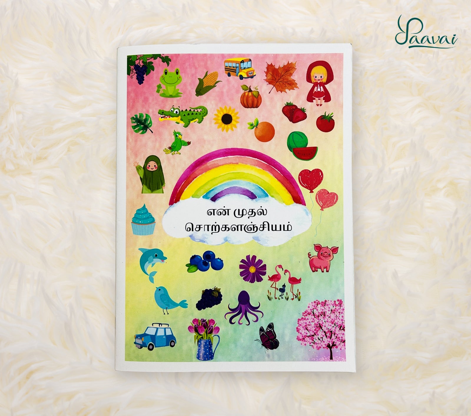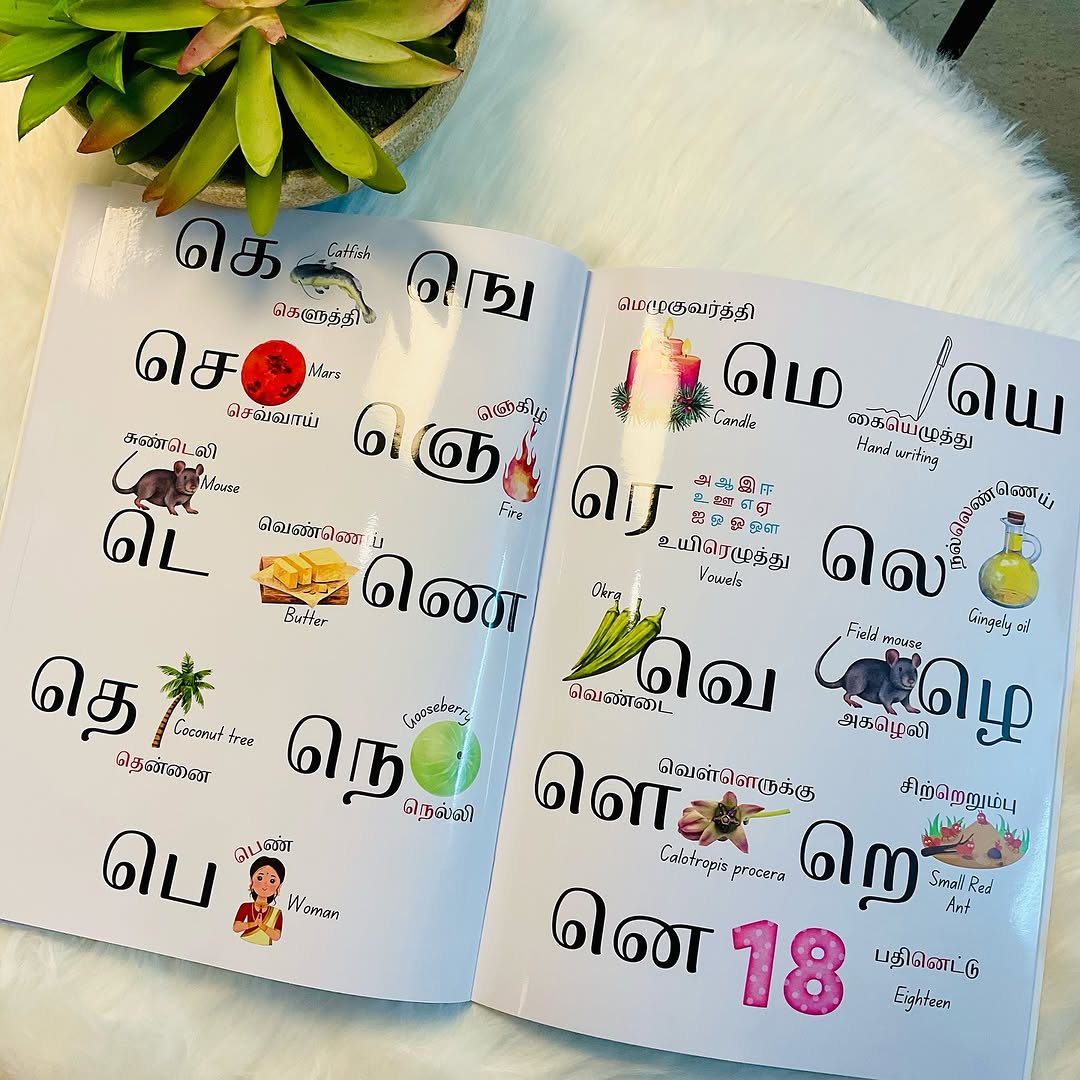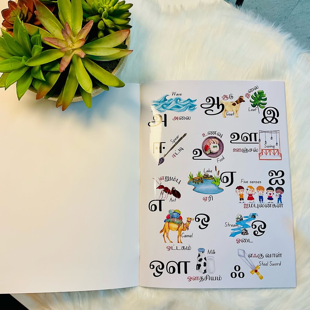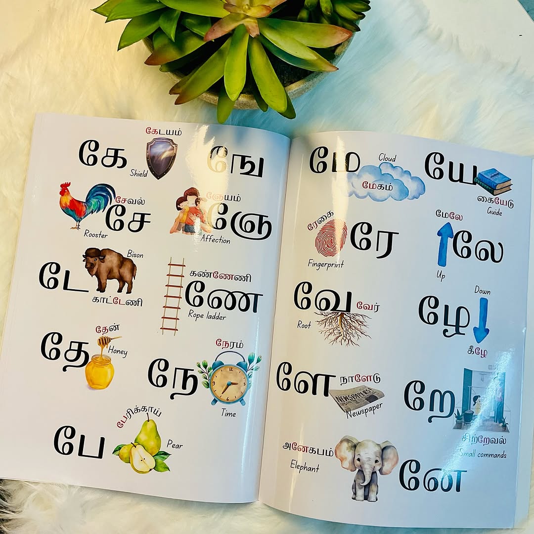 En Mudhal Sorkalanjiyam (என் முதல் சொற்களஞ்சியம்) is a beautifully crafted picture book that brings to life all 247 letters of the Tamil alphabet. 🏵️ Each page bursts with colorful illustrations and pairs object names in both Tamil and English, offering a joyful and engaging bilingual learning experience for young readers.